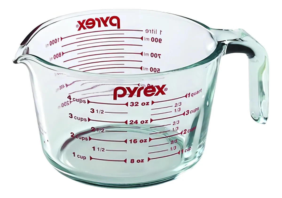 La Jarra Medidora Pyrex Basics de 1 litro es un elemento esencial en cualquier preparacion.